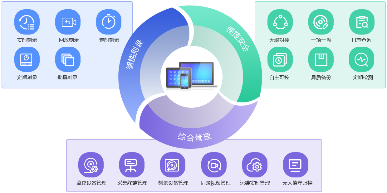 數據長期存儲、統一管理、多副本備份,數據1秒查詢提取,檢索查詢光盤刻錄歷史,三員管理,權責分明。